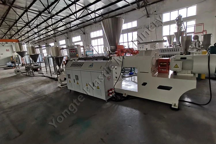 2024 yılında Polonyalı bir müşterimiz için özel olarak geri dönüştürülmüş PVC ve CaCO₃ dolgudan PVC masterbatch granülleri üretmek üzere tasarlanmış özel bir PVC bileşiği peletleme makinesi tasarladık. CaCO₃ dolgu içeriği, müşterinin üretim spesifikasyonlarına uyum sağlamak üzere %40 ila %80 arasında esnek bir şekilde ayarlanabilir. Temel bileşenler arasında otomatik besleyici, SJSZ80/156 konik çift vidalı ekstruder (ABB frekans invertörlü 75kW motor, stabil çalışma sırasında ~50KW tüketir), homojen granül kesimi için sıcak peletleme kalıbı ve 304 paslanmaz çelik üç aşamalı hızlı hava soğutma ve taşıma sistemi bulunur. Makine 300-400 kg/saat üretim kapasitesine sahiptir ve sıfır kesinti ile 7/24 sürekli çalışma için üretilmiştir. Yongte'nin uçtan uca yardım sağlayan uzman ekibi tarafından desteklenen kurulum sorunsuzdu. Kurulum sonrası, yerinde eğitim, müşterinin personelinin ekipmanı yetkin bir şekilde çalıştırmasını sağlarken, video rehberliği yoluyla uzaktan teknik destek, her türlü sorunun anında çözülmesini sağlayarak kesintisiz üretimin ve en yüksek performansın korunmasını sağladı.