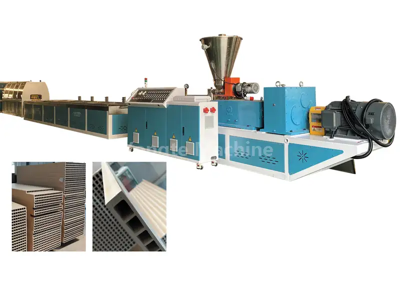 (1) Özel olarak tasarlanmış konik çift vidalı ekstruder, odun unu ve PVC reçine karışımlarını verimli bir şekilde taşıyabilir, odun ununun karbonizasyonunu veya PVC bozulmasını önlemek için malzemeleri hızlı bir şekilde plastikleştirebilir, üretim verimliliğini artırabilir ve enerji tüketimini azaltabilir. (2) Güç tüketimini %15-20 azaltmak için servo motor, yüksek iletim verimliliğine sahip doğrudan tahrikli dikey dişli kutusu ve istikrarlı, dayanıklı ve enerji tasarruflu otomatik ısıtma ve sıcaklık kontrol sistemi ile donatılmıştır.